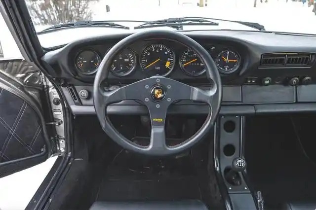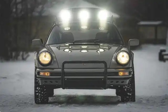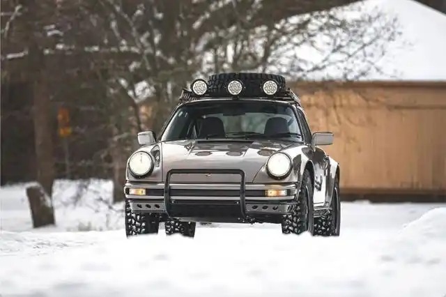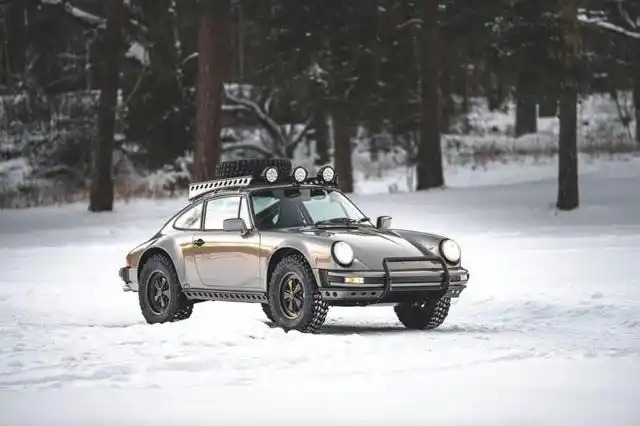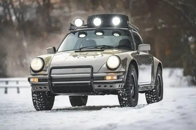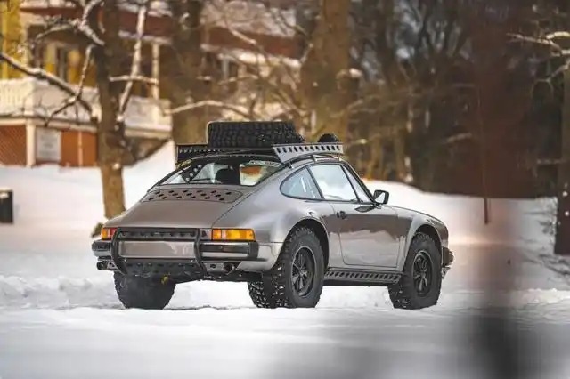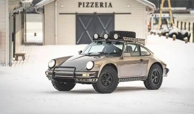 车头加装黑色防撞杆,车顶配备带备胎架的行李架和三盏硕大圆形射灯,搭配大花纹全地形胎。内饰选用Recaro专业赛车桶椅,配四点式安全带和定制防滚架,驾驶台保留911经典的五环式仪表,MOMO方向盘上的红色缝线与保时捷盾徽相互辉映。动力仍为那台3.0升风冷水平对置六缸,由Kiveriö Customs Oy负责引擎和变速箱工作,配备Bilstein拉力悬挂。所有改装由芬兰保时捷专家Carace操刀执行。